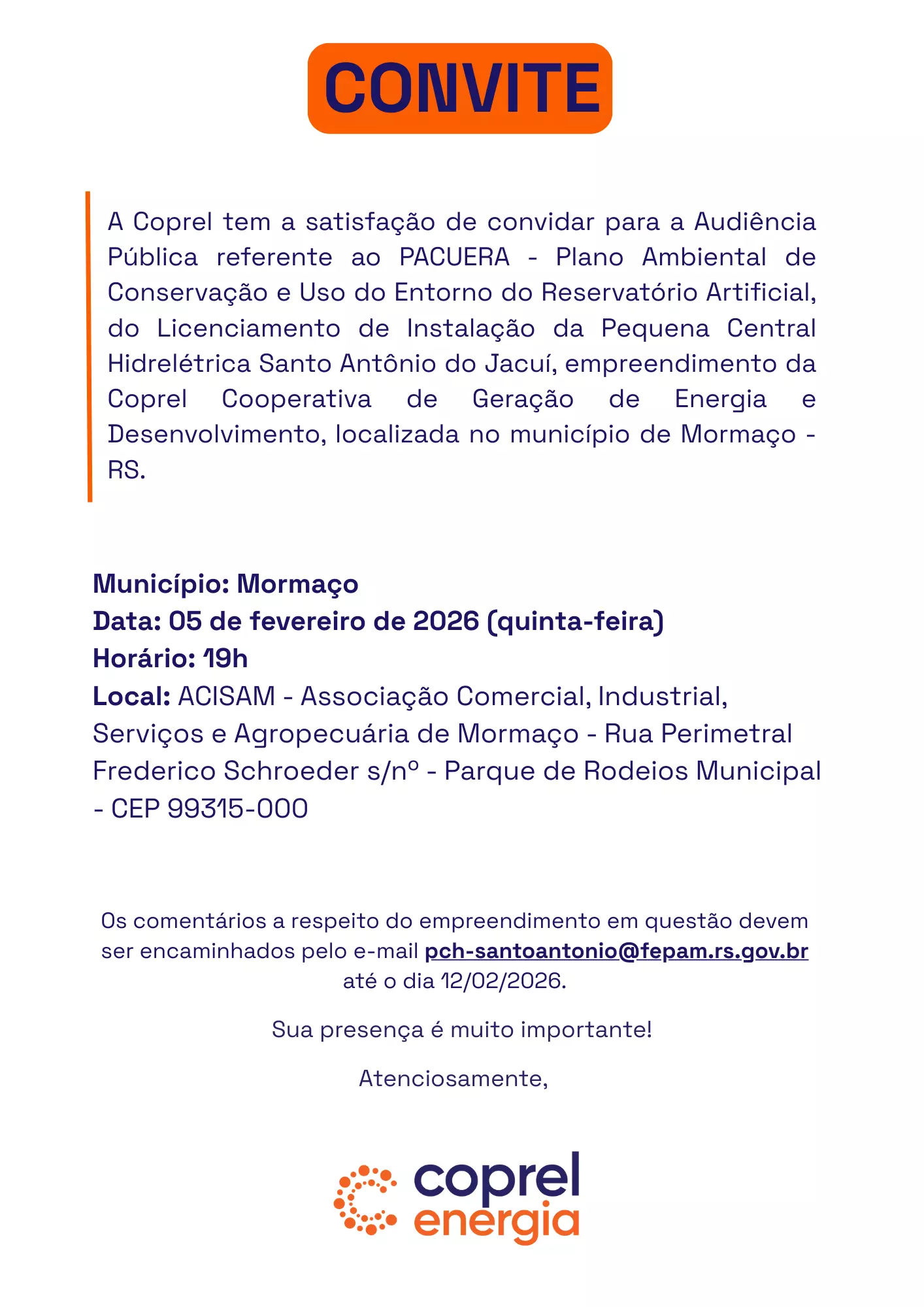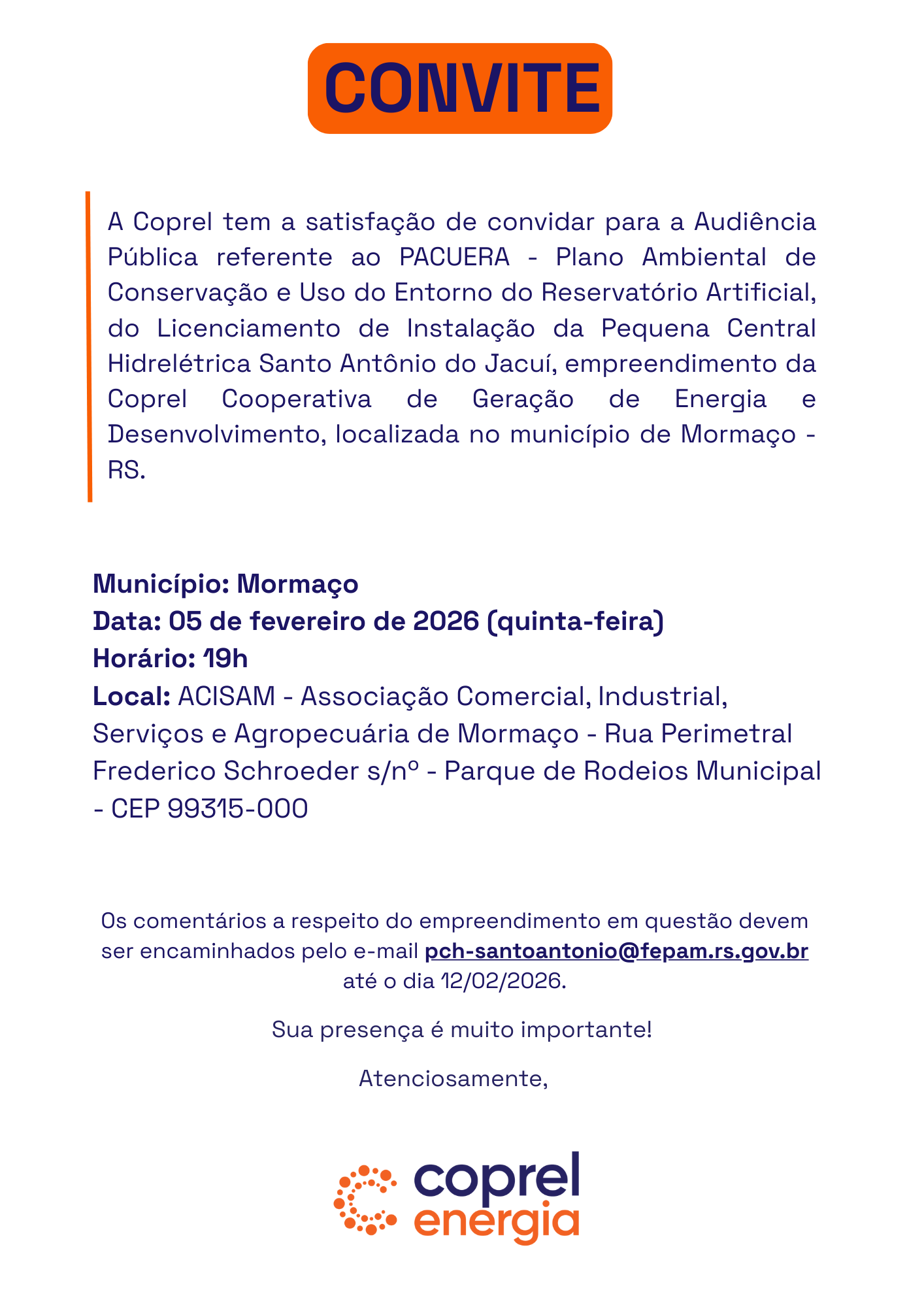 Os comentários a respeito do empreendimento em questão devem ser encaminhados pelo e-mail pch-santoantonio@fepam.rs.gov.br até o dia 12/02/2026.