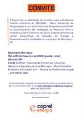 VoltarCoprel vai realizar Audiência Pública referente ao Pacuera da PCH Santo Antônio do Jacuí, em Mormaço